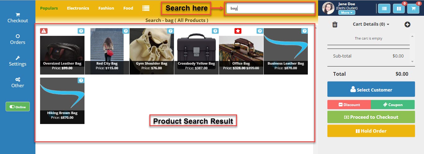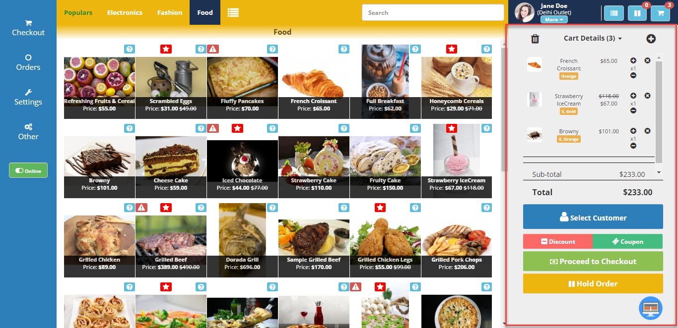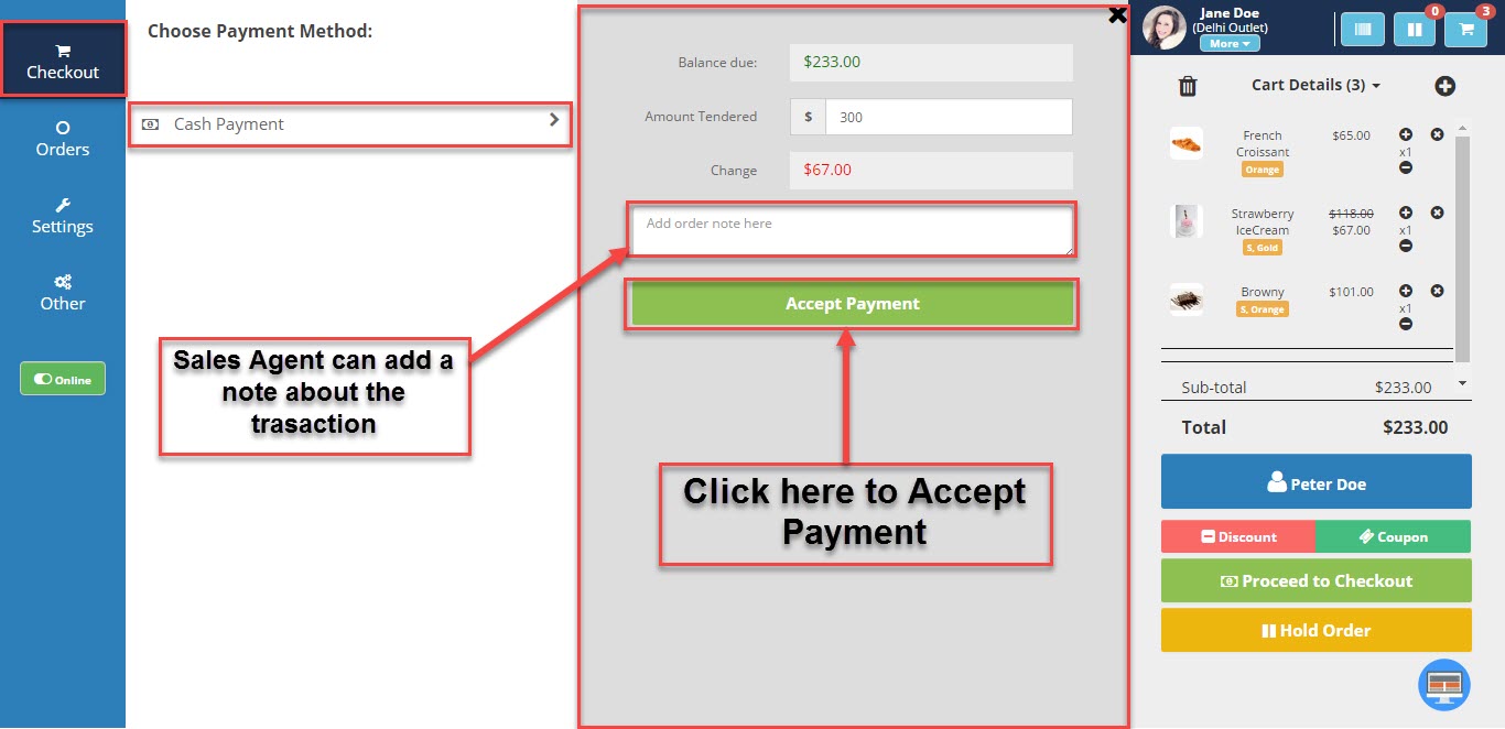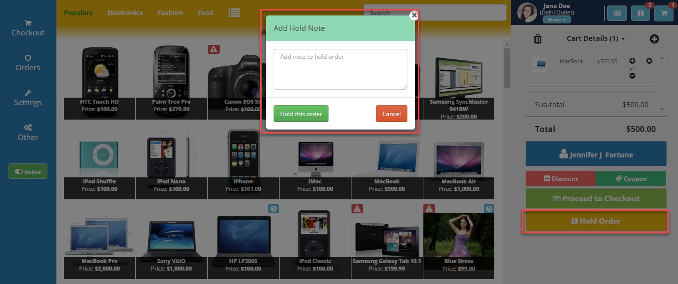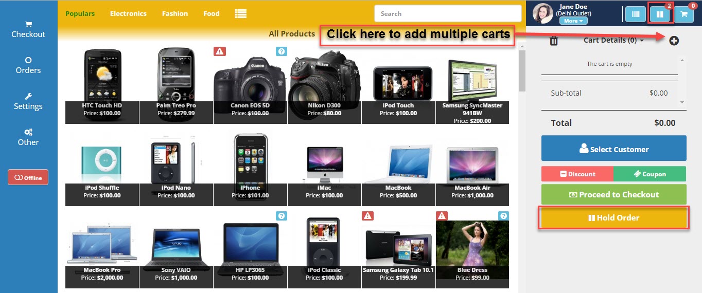 The Sales Agent can create multiple carts and can hold the transactions at any time. He/She can easily proceed to the next transaction/order without deleting the uncompleted order/hold order.