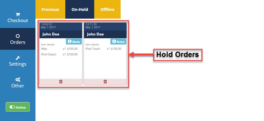 When the sales agent click on any order on hold, the order will be added back to the cart and the sales agent can view the order details and can Proceed to Checkout.