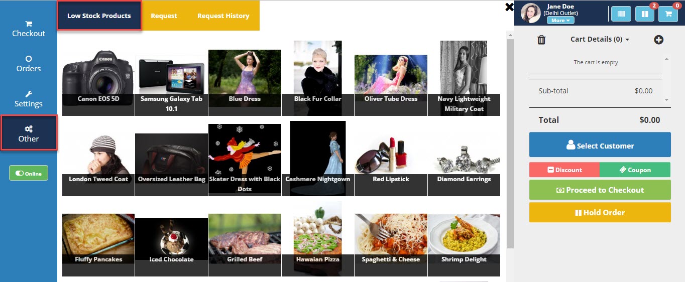 In the Inventory section, the sales agent will find three options – Low Stock Products, Request, and Request History.