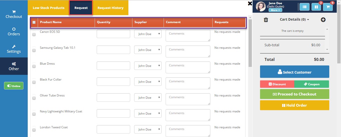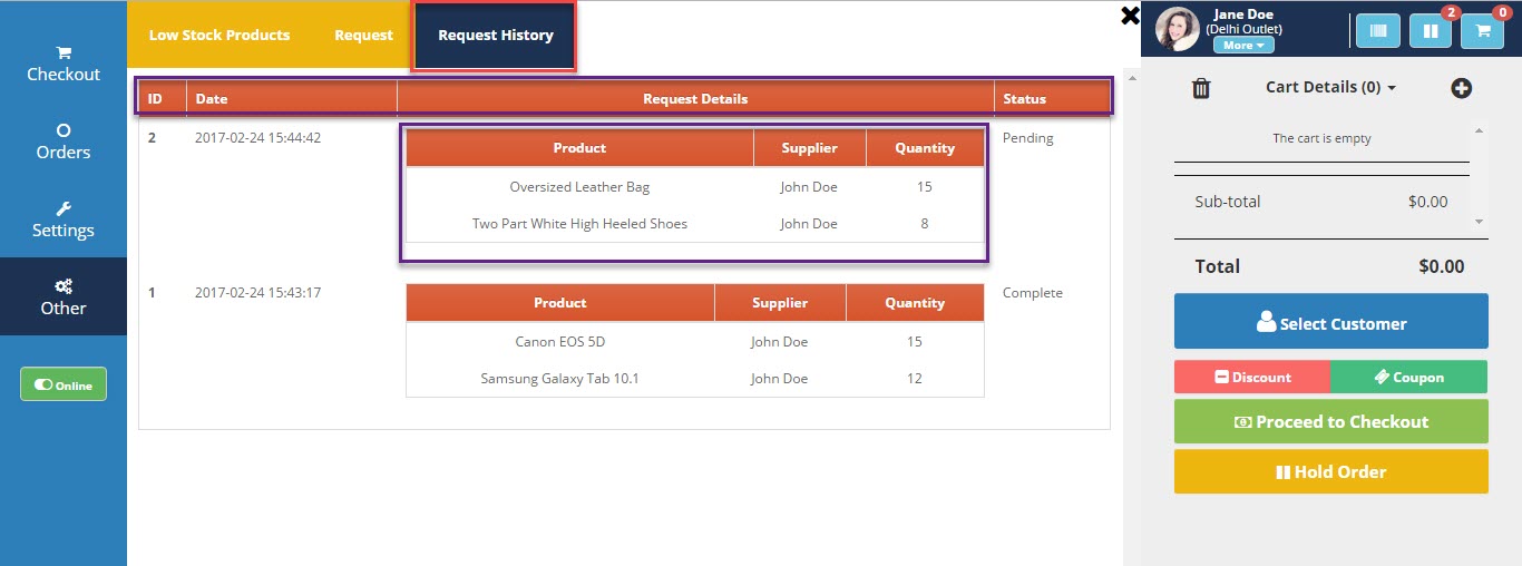 In the Request Section, the sales agent can create a request to the supplier to supply new stock. The sales agent can generate a request with product quantity that he/she needs to be supplied for a particular product.